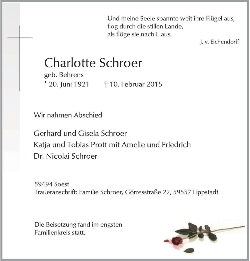 Hier finden Sie alle Traueranzeigen aus der Zeitung, die bisher für Charlotte Schroer erschienen sind. Weitere Traueranzeigen, die in der Zeitung erscheinen, werden hier ebenfalls aufgelistet