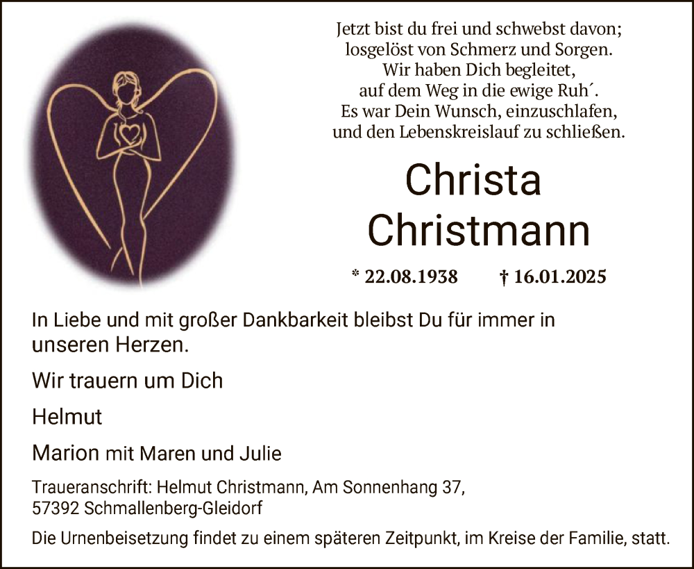 Hier finden Sie alle Traueranzeigen aus der Zeitung, die bisher für Christa Christmann erschienen sind. Weitere Traueranzeigen, die in der Zeitung erscheinen, werden hier ebenfalls aufgelistet