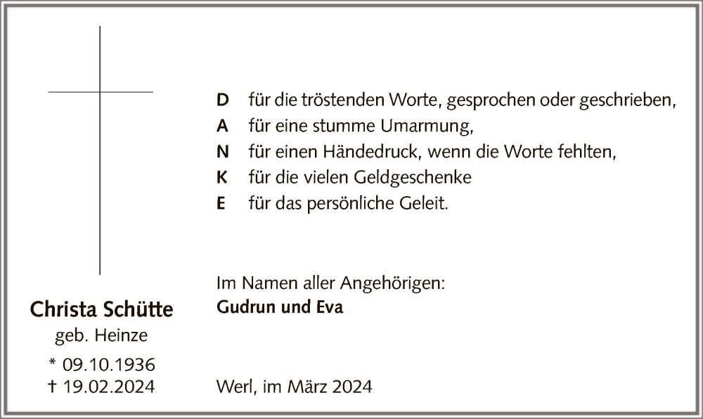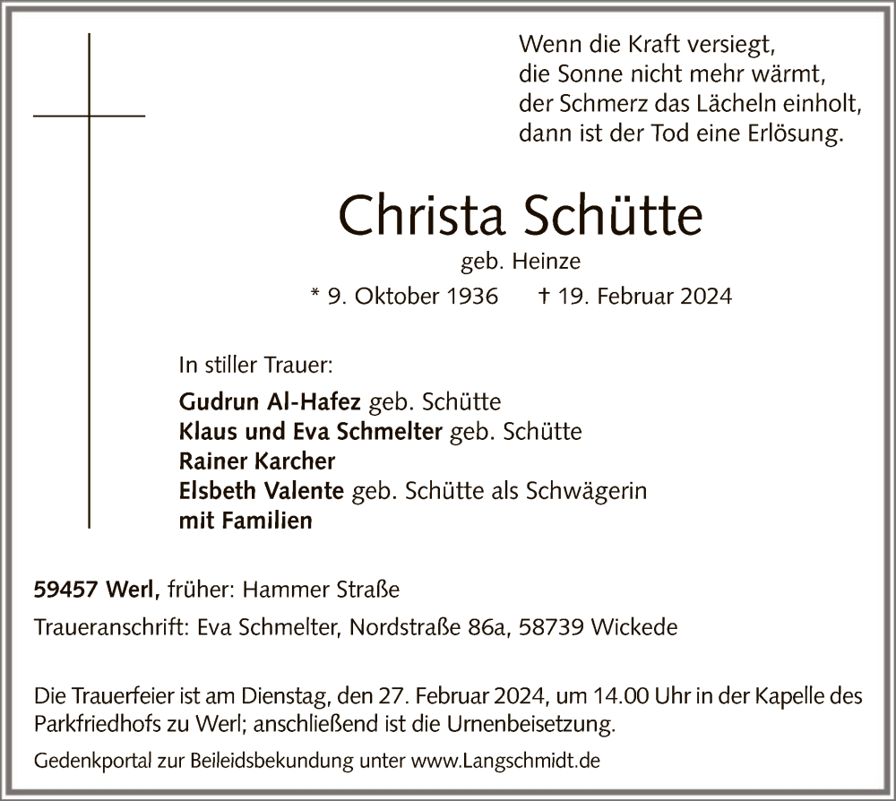 Hier finden Sie alle Traueranzeigen aus der Zeitung, die bisher für Christa Schütte erschienen sind. Weitere Traueranzeigen, die in der Zeitung erscheinen, werden hier ebenfalls aufgelistet