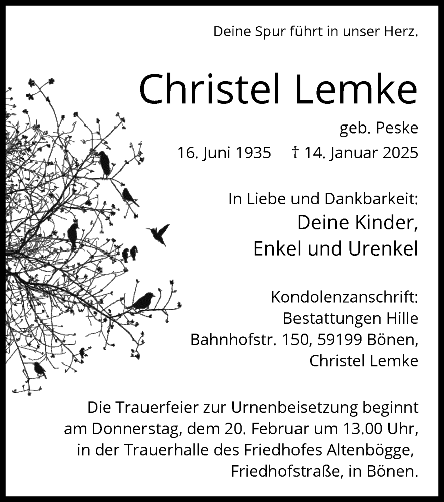 Hier finden Sie alle Traueranzeigen aus der Zeitung, die bisher für Christel Lemke erschienen sind. Weitere Traueranzeigen, die in der Zeitung erscheinen, werden hier ebenfalls aufgelistet