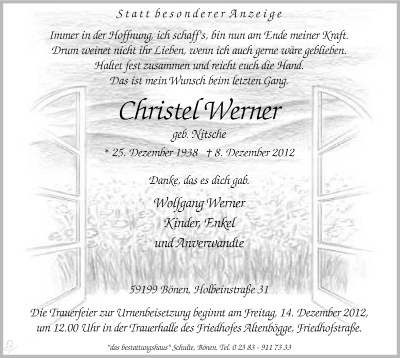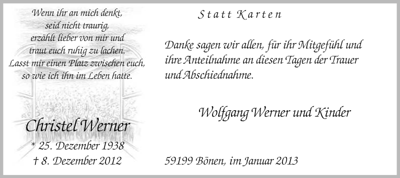 Hier finden Sie alle Traueranzeigen aus der Zeitung, die bisher für Christel Werner erschienen sind. Weitere Traueranzeigen, die in der Zeitung erscheinen, werden hier ebenfalls aufgelistet