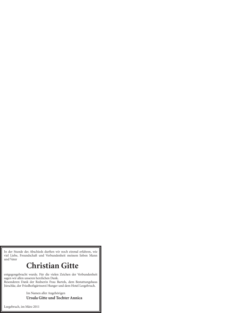 Hier finden Sie alle Traueranzeigen aus der Zeitung, die bisher für Christian Gitte erschienen sind. Weitere Traueranzeigen, die in der Zeitung erscheinen, werden hier ebenfalls aufgelistet