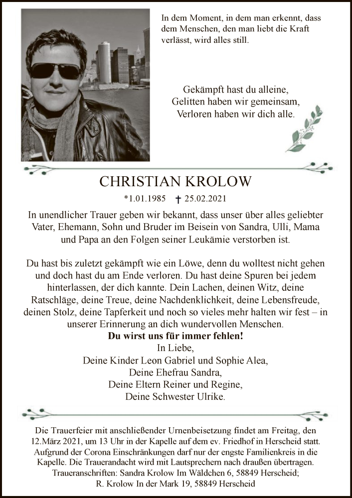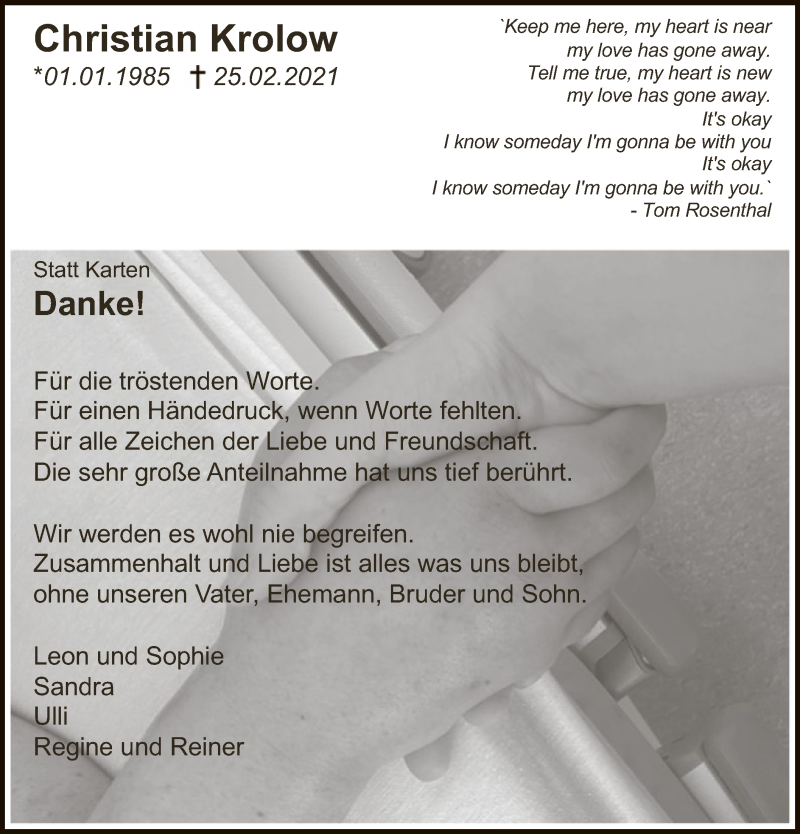 Hier finden Sie alle Traueranzeigen aus der Zeitung, die bisher für Christian Krolow erschienen sind. Weitere Traueranzeigen, die in der Zeitung erscheinen, werden hier ebenfalls aufgelistet