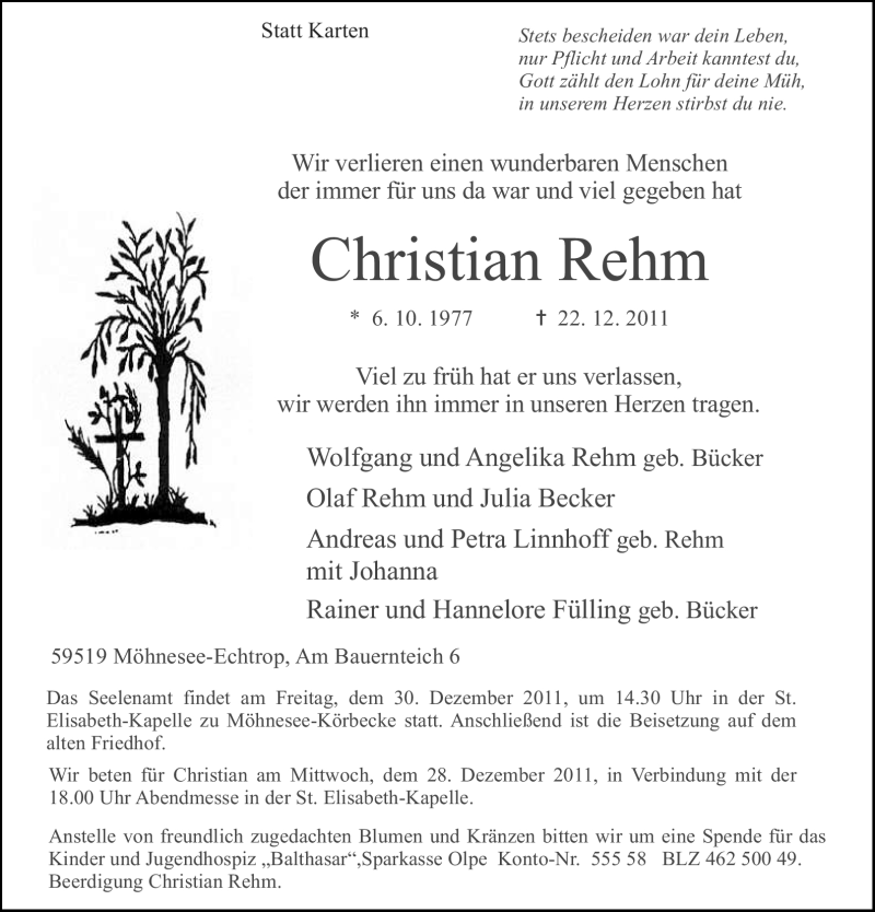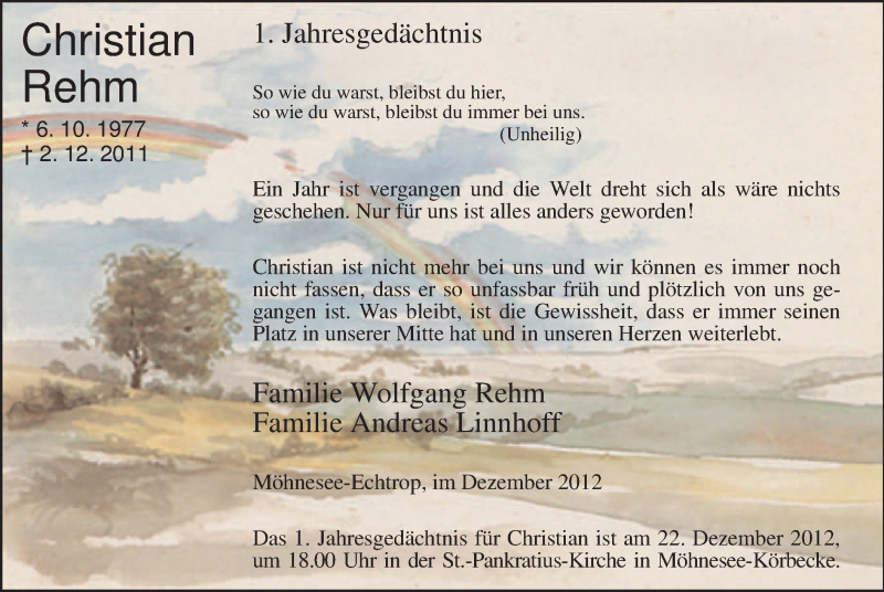 Hier finden Sie alle Traueranzeigen aus der Zeitung, die bisher für Christian Rehm erschienen sind. Weitere Traueranzeigen, die in der Zeitung erscheinen, werden hier ebenfalls aufgelistet