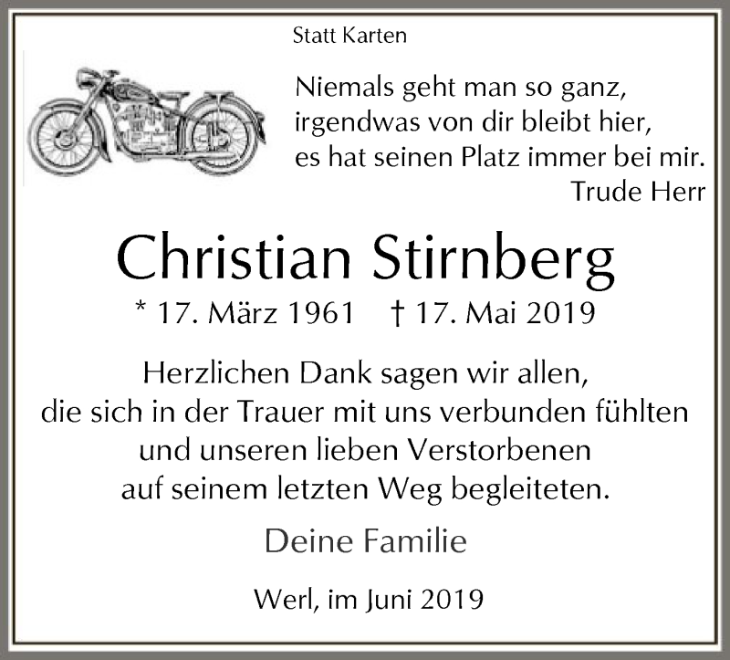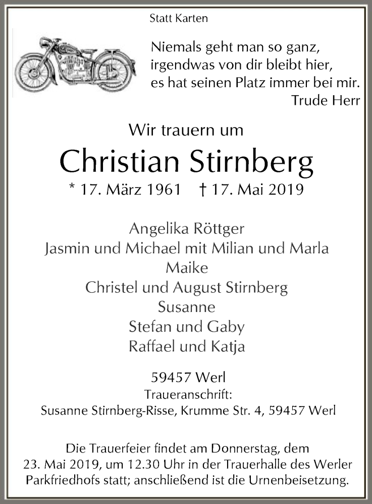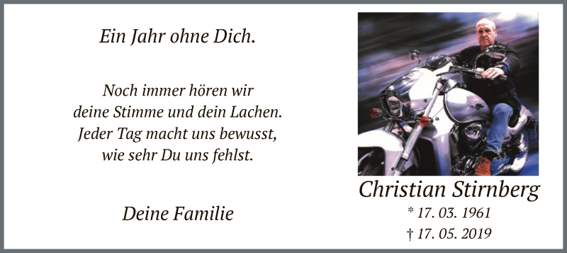 Hier finden Sie alle Traueranzeigen aus der Zeitung, die bisher für Christian Stirnberg erschienen sind. Weitere Traueranzeigen, die in der Zeitung erscheinen, werden hier ebenfalls aufgelistet