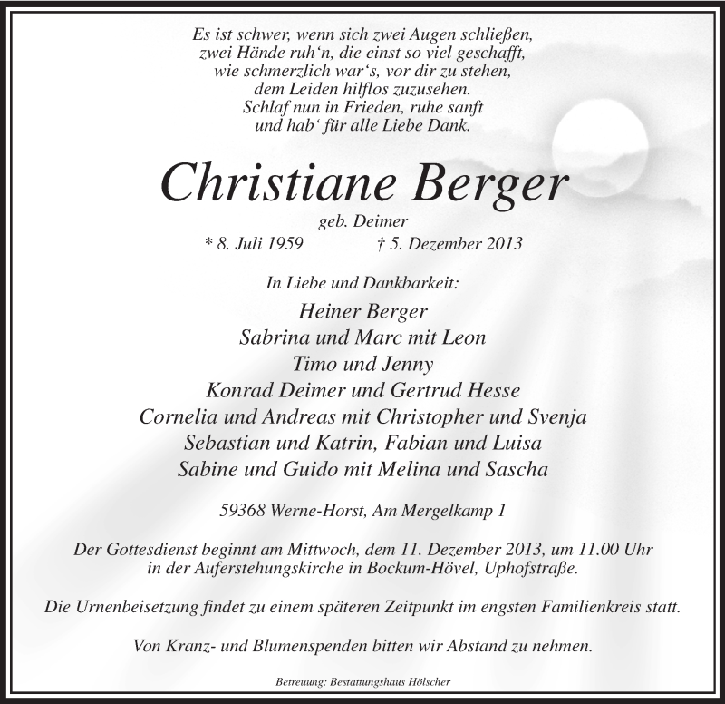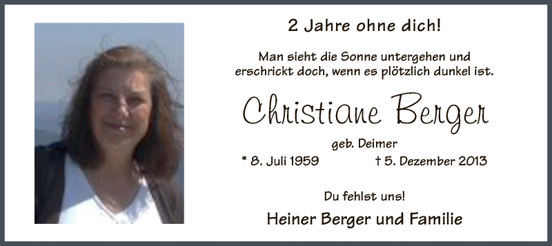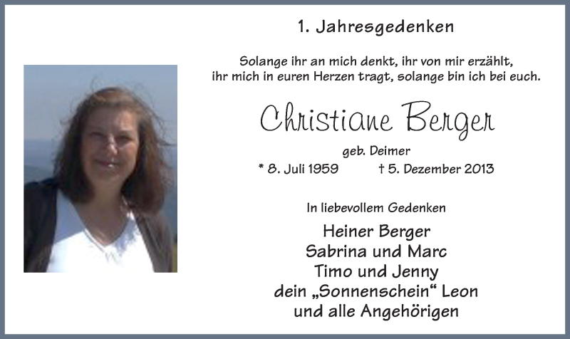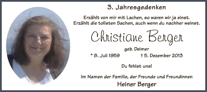 Hier finden Sie alle Traueranzeigen aus der Zeitung, die bisher für Christiane Berger erschienen sind. Weitere Traueranzeigen, die in der Zeitung erscheinen, werden hier ebenfalls aufgelistet