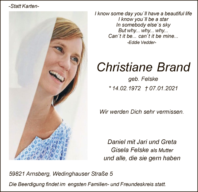Hier finden Sie alle Traueranzeigen aus der Zeitung, die bisher für Christiane Brand erschienen sind. Weitere Traueranzeigen, die in der Zeitung erscheinen, werden hier ebenfalls aufgelistet