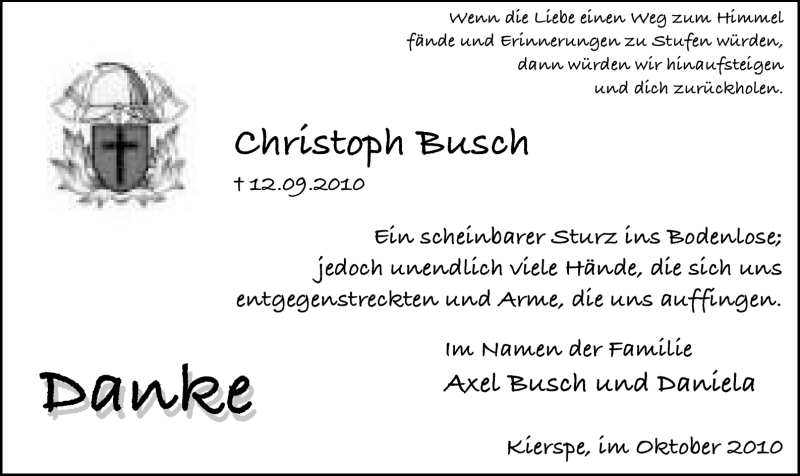 Hier finden Sie alle Traueranzeigen aus der Zeitung, die bisher für Christoph Busch erschienen sind. Weitere Traueranzeigen, die in der Zeitung erscheinen, werden hier ebenfalls aufgelistet