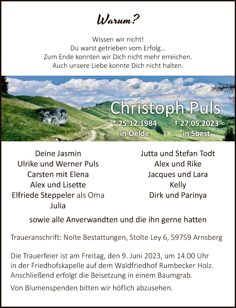 Hier finden Sie alle Traueranzeigen aus der Zeitung, die bisher für Christoph Puls erschienen sind. Weitere Traueranzeigen, die in der Zeitung erscheinen, werden hier ebenfalls aufgelistet