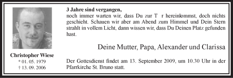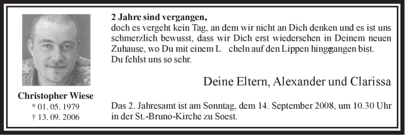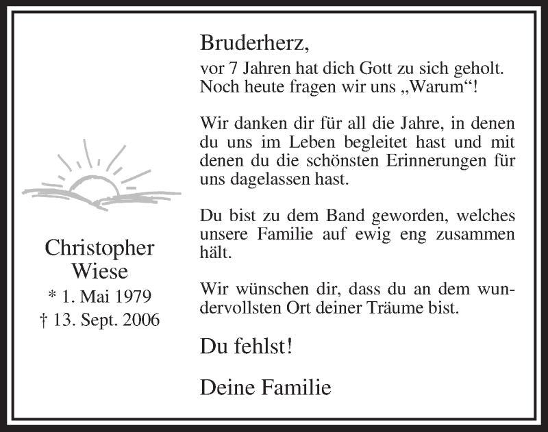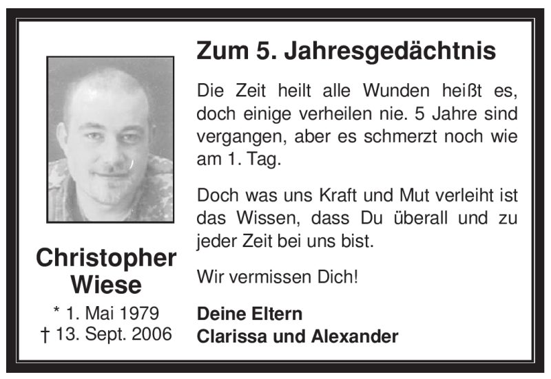 Hier finden Sie alle Traueranzeigen aus der Zeitung, die bisher für Christopher Wiese erschienen sind. Weitere Traueranzeigen, die in der Zeitung erscheinen, werden hier ebenfalls aufgelistet