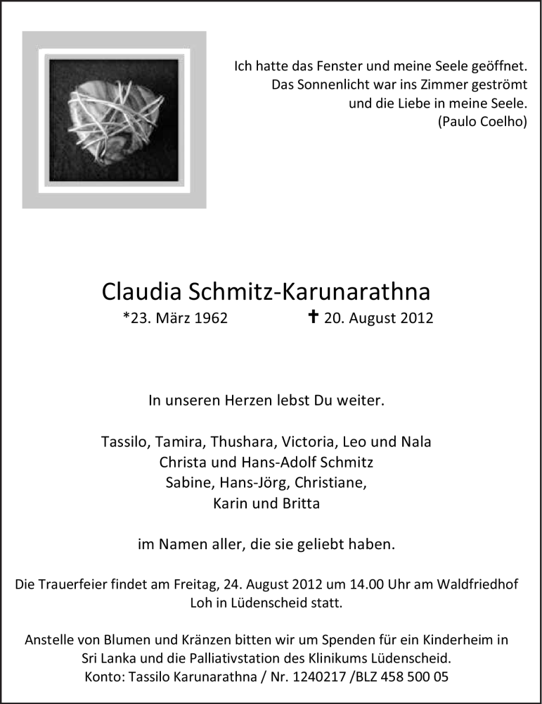 Hier finden Sie alle Traueranzeigen aus der Zeitung, die bisher für Claudia Schmitz-Karunarathna erschienen sind. Weitere Traueranzeigen, die in der Zeitung erscheinen, werden hier ebenfalls aufgelistet