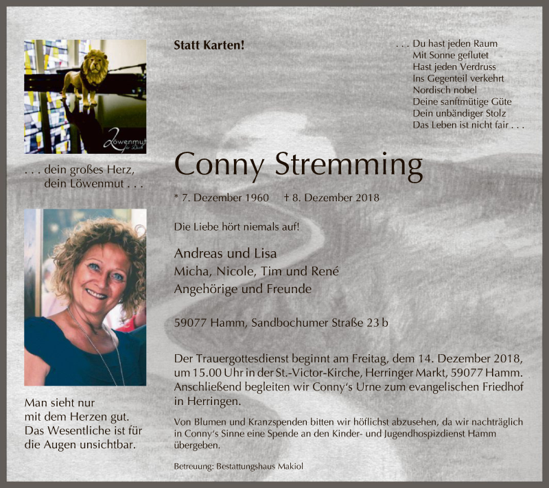 Hier finden Sie alle Traueranzeigen aus der Zeitung, die bisher für Conny Stremming erschienen sind. Weitere Traueranzeigen, die in der Zeitung erscheinen, werden hier ebenfalls aufgelistet