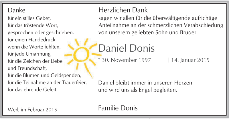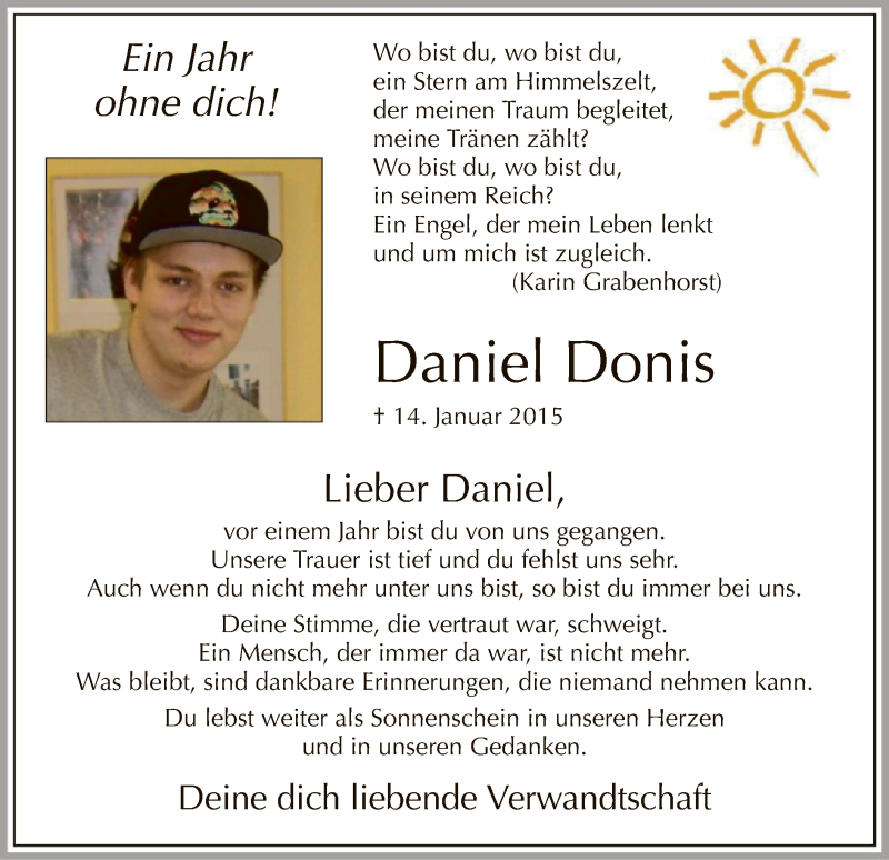 Hier finden Sie alle Traueranzeigen aus der Zeitung, die bisher für Daniel Donis erschienen sind. Weitere Traueranzeigen, die in der Zeitung erscheinen, werden hier ebenfalls aufgelistet