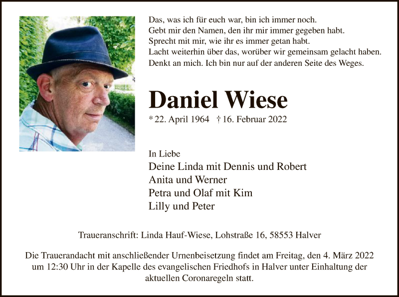 Hier finden Sie alle Traueranzeigen aus der Zeitung, die bisher für Daniel Wiese erschienen sind. Weitere Traueranzeigen, die in der Zeitung erscheinen, werden hier ebenfalls aufgelistet