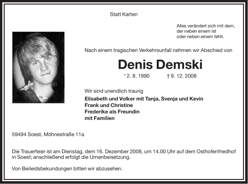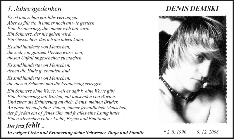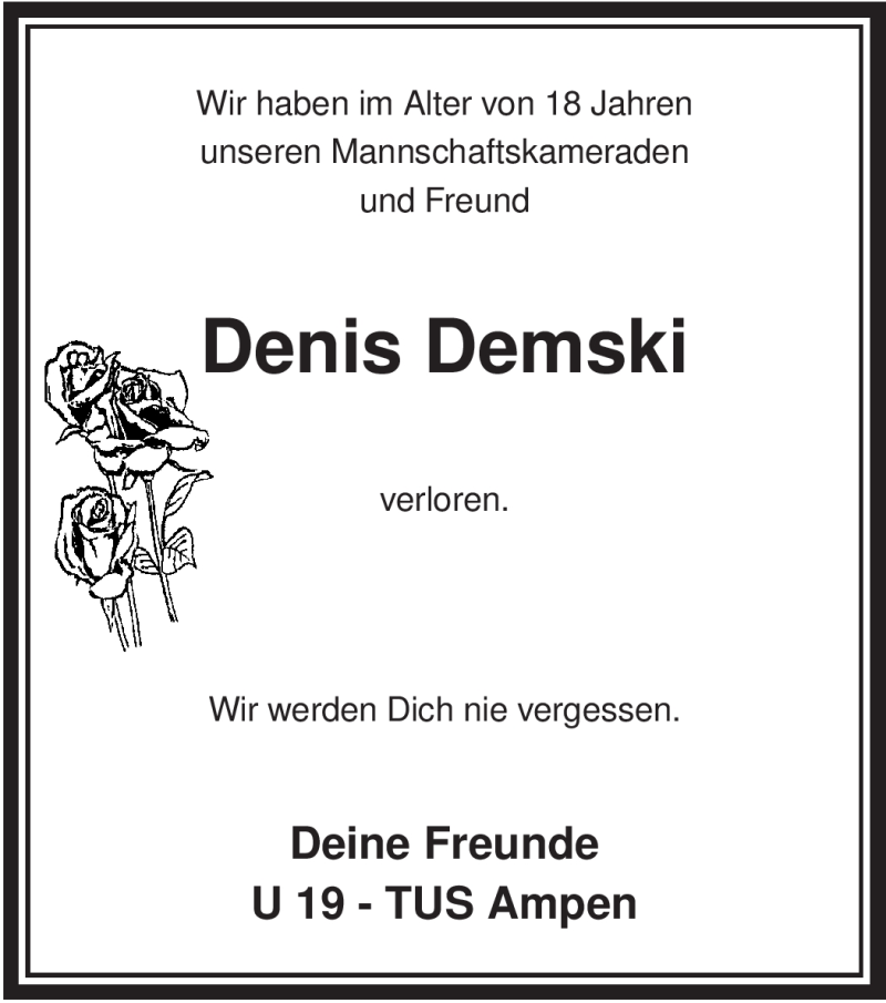 Hier finden Sie alle Traueranzeigen aus der Zeitung, die bisher für Denis Demski erschienen sind. Weitere Traueranzeigen, die in der Zeitung erscheinen, werden hier ebenfalls aufgelistet