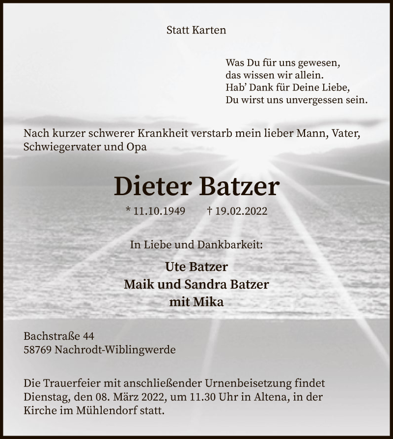 Hier finden Sie alle Traueranzeigen aus der Zeitung, die bisher für Dieter Batzer erschienen sind. Weitere Traueranzeigen, die in der Zeitung erscheinen, werden hier ebenfalls aufgelistet