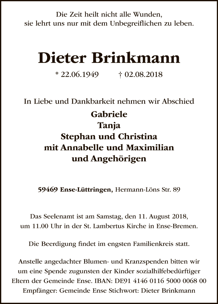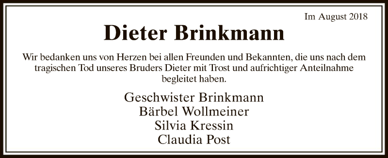 Hier finden Sie alle Traueranzeigen aus der Zeitung, die bisher für Dieter Brinkmann erschienen sind. Weitere Traueranzeigen, die in der Zeitung erscheinen, werden hier ebenfalls aufgelistet