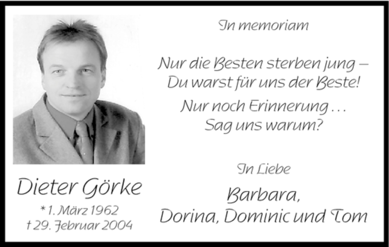 Hier finden Sie alle Traueranzeigen aus der Zeitung, die bisher für Dieter Görke erschienen sind. Weitere Traueranzeigen, die in der Zeitung erscheinen, werden hier ebenfalls aufgelistet
