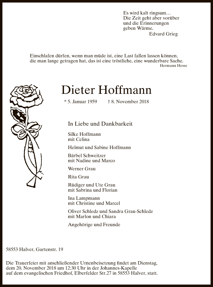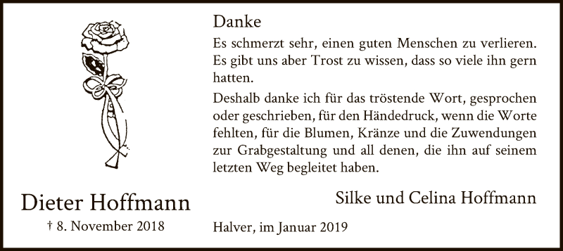 Hier finden Sie alle Traueranzeigen aus der Zeitung, die bisher für Dieter Hoffmann erschienen sind. Weitere Traueranzeigen, die in der Zeitung erscheinen, werden hier ebenfalls aufgelistet