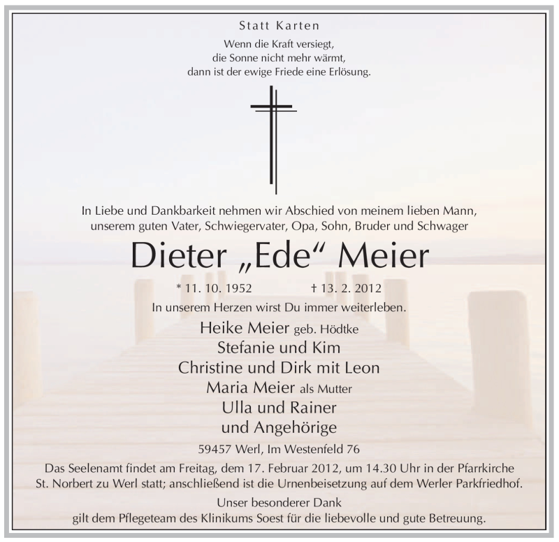 Hier finden Sie alle Traueranzeigen aus der Zeitung, die bisher für Dieter Meier erschienen sind. Weitere Traueranzeigen, die in der Zeitung erscheinen, werden hier ebenfalls aufgelistet