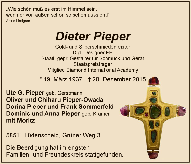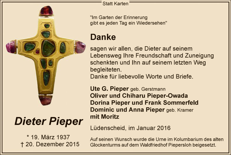 Hier finden Sie alle Traueranzeigen aus der Zeitung, die bisher für Dieter Pieper erschienen sind. Weitere Traueranzeigen, die in der Zeitung erscheinen, werden hier ebenfalls aufgelistet