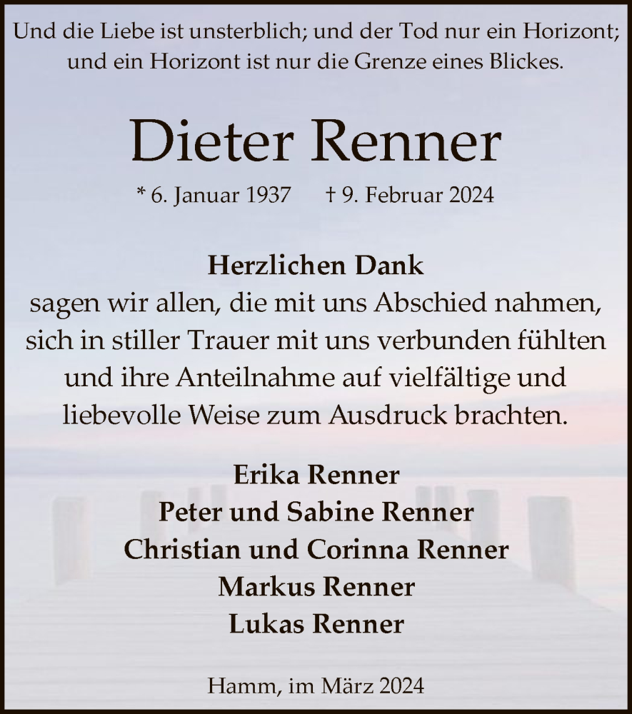 Hier finden Sie alle Traueranzeigen aus der Zeitung, die bisher für Dieter Renner erschienen sind. Weitere Traueranzeigen, die in der Zeitung erscheinen, werden hier ebenfalls aufgelistet
