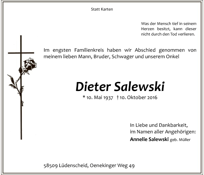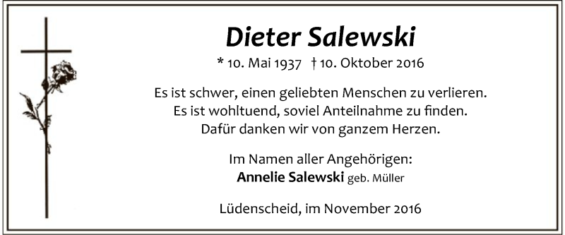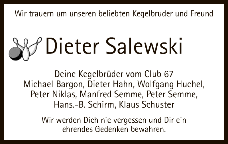 Hier finden Sie alle Traueranzeigen aus der Zeitung, die bisher für Dieter Salewski erschienen sind. Weitere Traueranzeigen, die in der Zeitung erscheinen, werden hier ebenfalls aufgelistet
