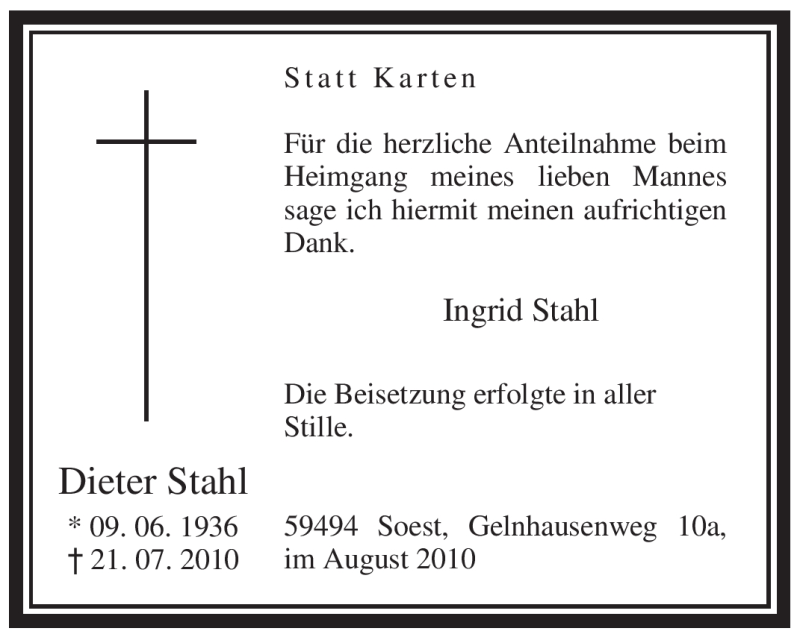 Hier finden Sie alle Traueranzeigen aus der Zeitung, die bisher für Dieter Stahl erschienen sind. Weitere Traueranzeigen, die in der Zeitung erscheinen, werden hier ebenfalls aufgelistet