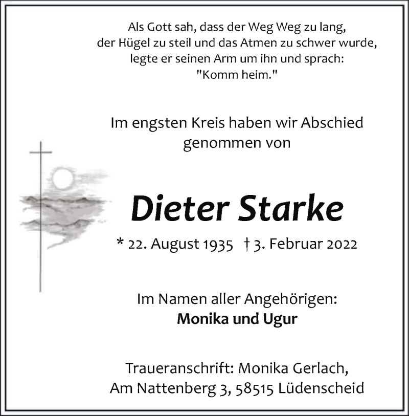 Hier finden Sie alle Traueranzeigen aus der Zeitung, die bisher für Dieter Starke erschienen sind. Weitere Traueranzeigen, die in der Zeitung erscheinen, werden hier ebenfalls aufgelistet