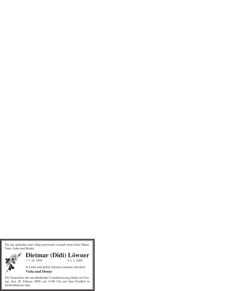 Hier finden Sie alle Traueranzeigen aus der Zeitung, die bisher für Dietmar (Didi Löwner erschienen sind. Weitere Traueranzeigen, die in der Zeitung erscheinen, werden hier ebenfalls aufgelistet