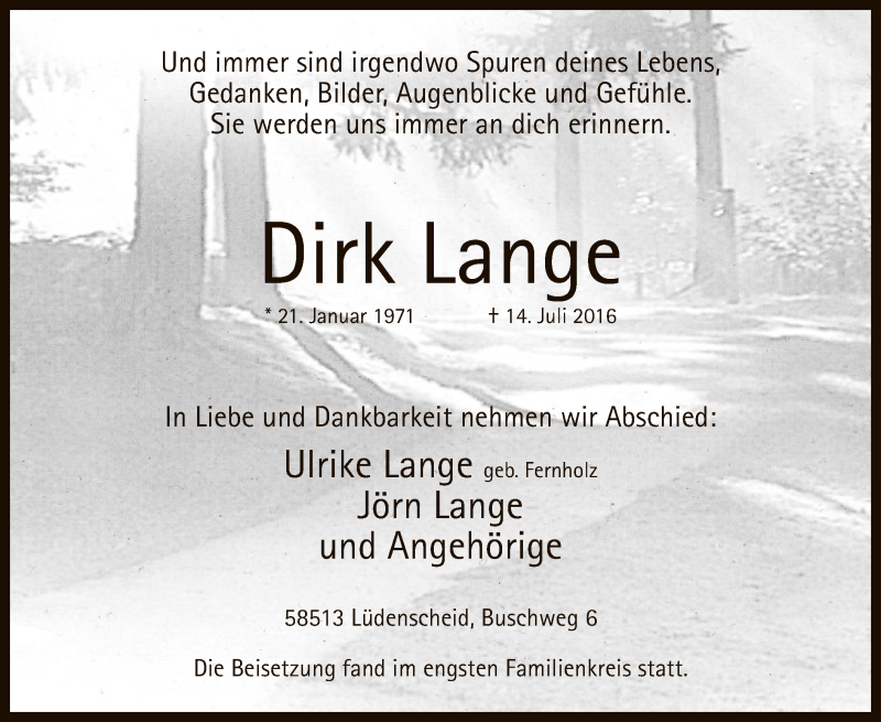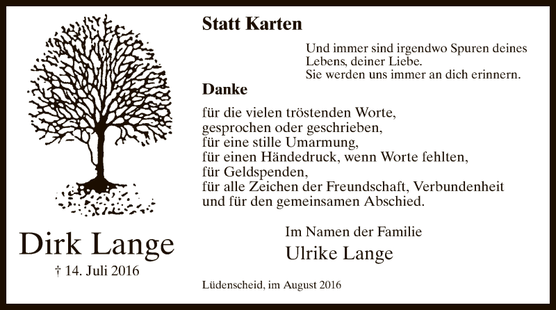 Hier finden Sie alle Traueranzeigen aus der Zeitung, die bisher für Dirk Lange erschienen sind. Weitere Traueranzeigen, die in der Zeitung erscheinen, werden hier ebenfalls aufgelistet