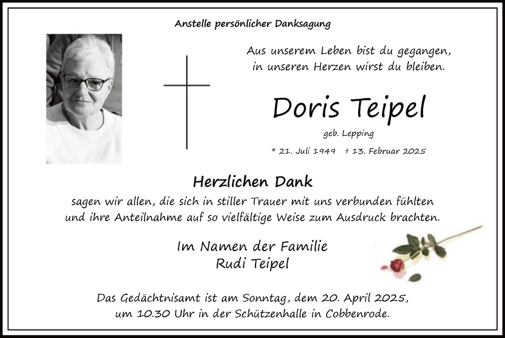 Hier finden Sie alle Traueranzeigen aus der Zeitung, die bisher für Doris Teipel erschienen sind. Weitere Traueranzeigen, die in der Zeitung erscheinen, werden hier ebenfalls aufgelistet