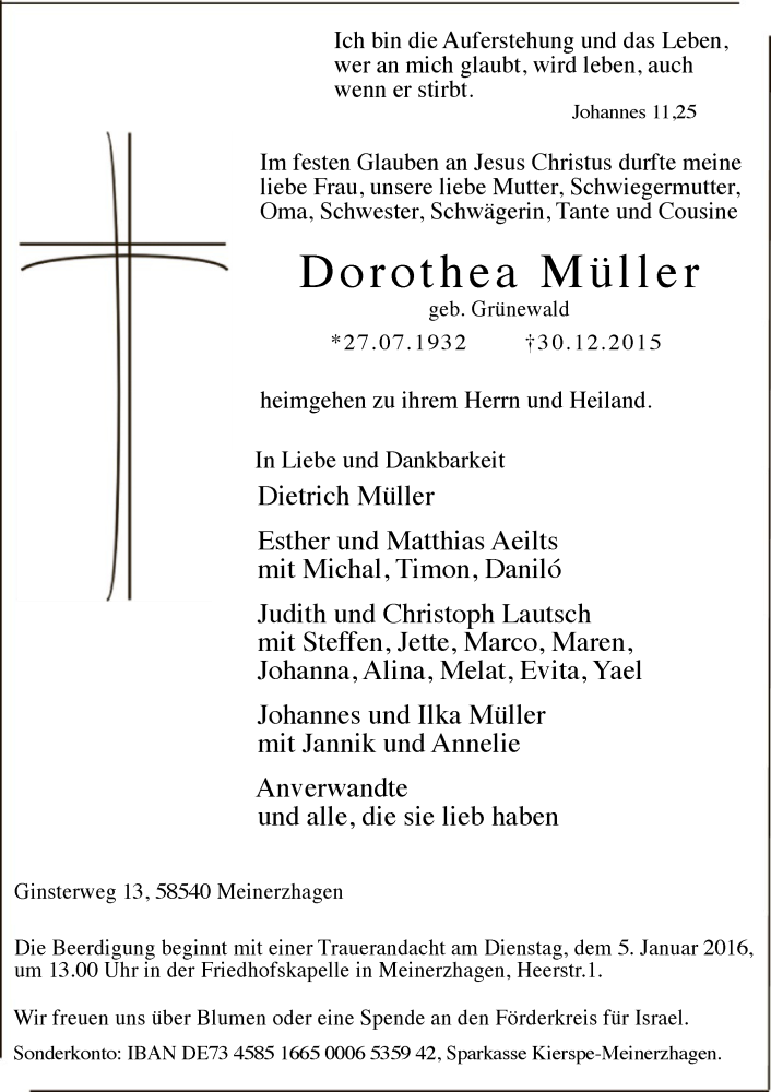 Hier finden Sie alle Traueranzeigen aus der Zeitung, die bisher für Dorothea Müller erschienen sind. Weitere Traueranzeigen, die in der Zeitung erscheinen, werden hier ebenfalls aufgelistet