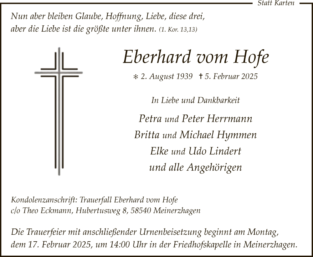 Hier finden Sie alle Traueranzeigen aus der Zeitung, die bisher für Eberhard vom Hofe erschienen sind. Weitere Traueranzeigen, die in der Zeitung erscheinen, werden hier ebenfalls aufgelistet