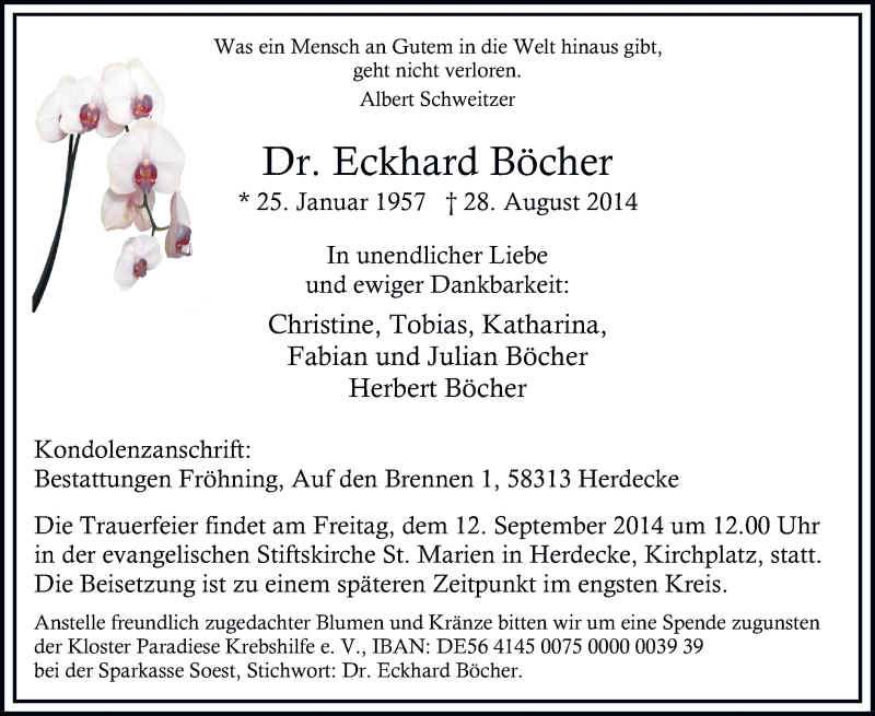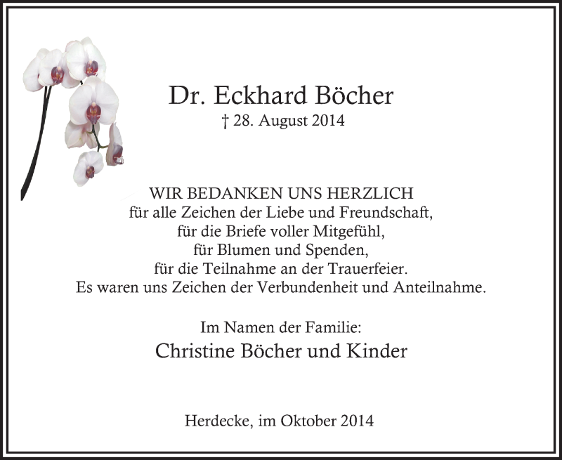 Hier finden Sie alle Traueranzeigen aus der Zeitung, die bisher für Eckhard Böcher erschienen sind. Weitere Traueranzeigen, die in der Zeitung erscheinen, werden hier ebenfalls aufgelistet