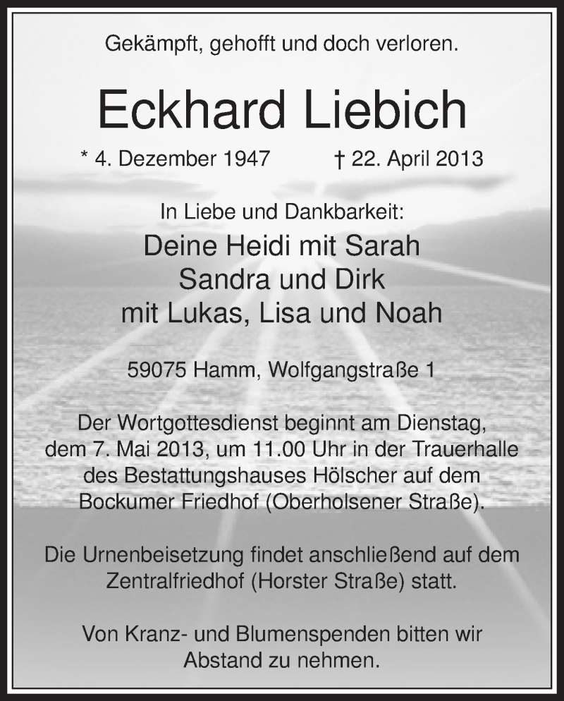 Hier finden Sie alle Traueranzeigen aus der Zeitung, die bisher für Eckhard Liebich erschienen sind. Weitere Traueranzeigen, die in der Zeitung erscheinen, werden hier ebenfalls aufgelistet