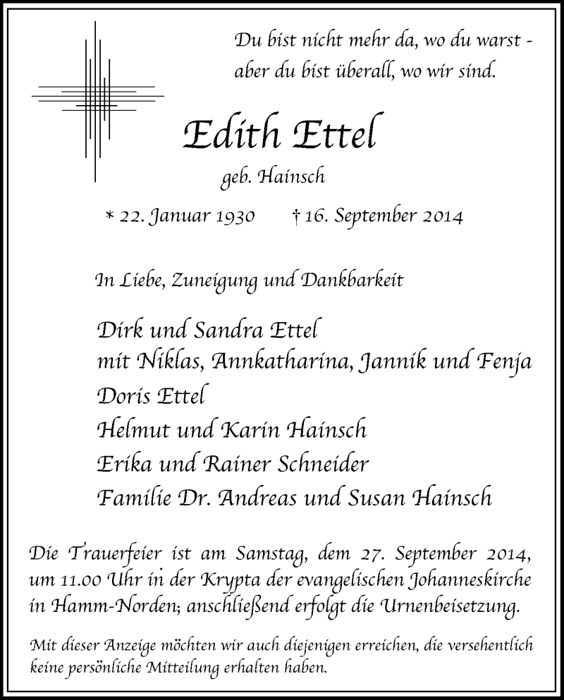 Hier finden Sie alle Traueranzeigen aus der Zeitung, die bisher für Edith Ettel erschienen sind. Weitere Traueranzeigen, die in der Zeitung erscheinen, werden hier ebenfalls aufgelistet