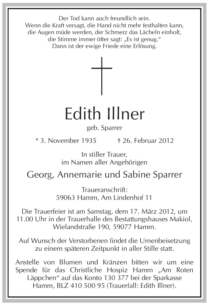 Hier finden Sie alle Traueranzeigen aus der Zeitung, die bisher für Edith Illner erschienen sind. Weitere Traueranzeigen, die in der Zeitung erscheinen, werden hier ebenfalls aufgelistet
