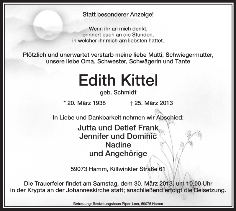 Hier finden Sie alle Traueranzeigen aus der Zeitung, die bisher für Edith Kittel erschienen sind. Weitere Traueranzeigen, die in der Zeitung erscheinen, werden hier ebenfalls aufgelistet