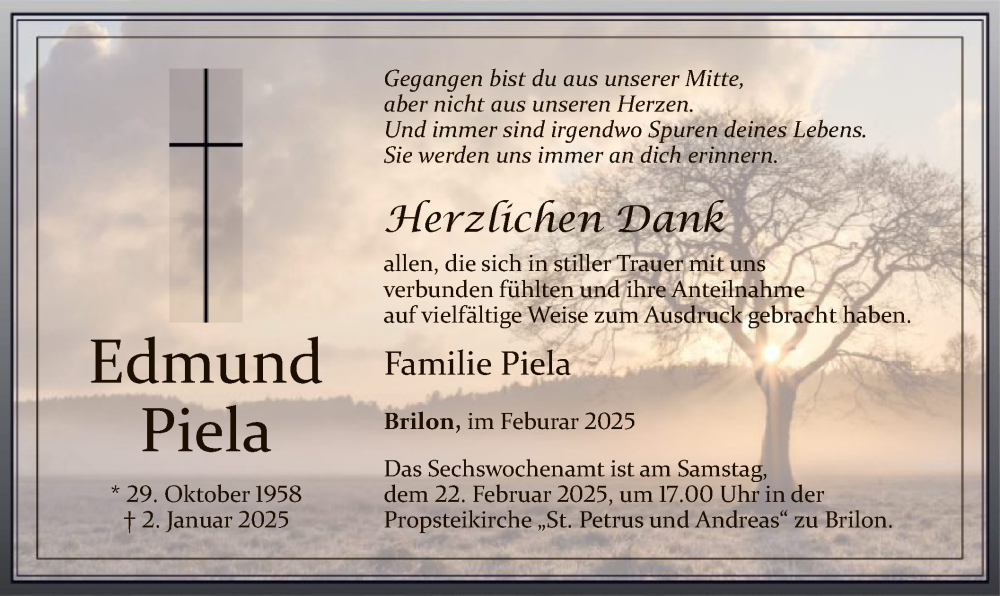 Hier finden Sie alle Traueranzeigen aus der Zeitung, die bisher für Edmund Piela erschienen sind. Weitere Traueranzeigen, die in der Zeitung erscheinen, werden hier ebenfalls aufgelistet