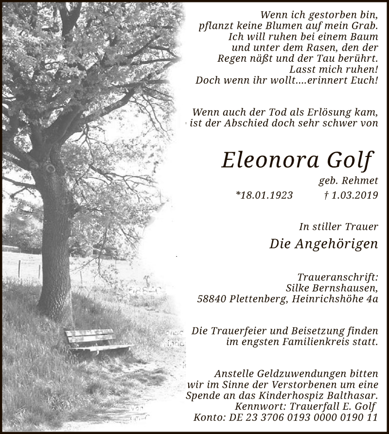 Hier finden Sie alle Traueranzeigen aus der Zeitung, die bisher für Eleonora Golf erschienen sind. Weitere Traueranzeigen, die in der Zeitung erscheinen, werden hier ebenfalls aufgelistet