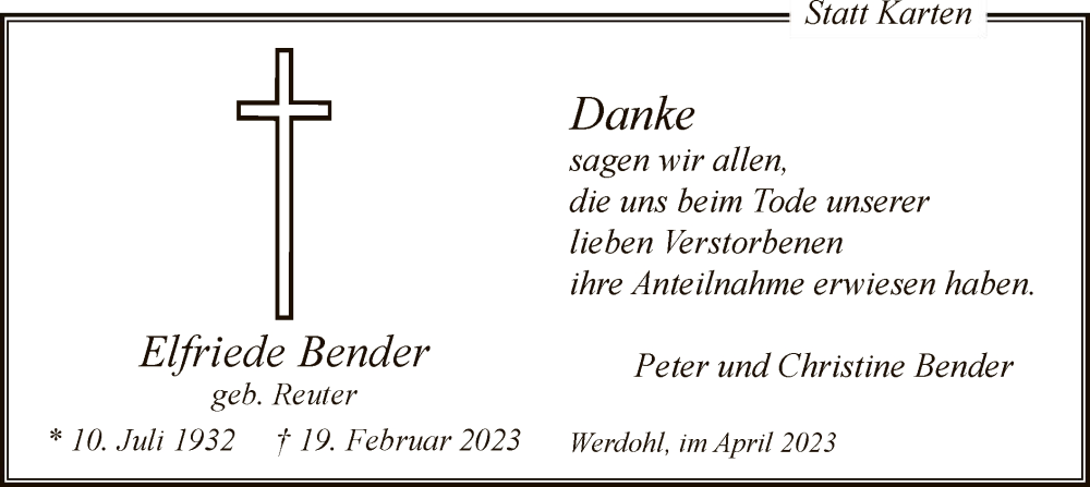 Hier finden Sie alle Traueranzeigen aus der Zeitung, die bisher für Elfriede Bender erschienen sind. Weitere Traueranzeigen, die in der Zeitung erscheinen, werden hier ebenfalls aufgelistet