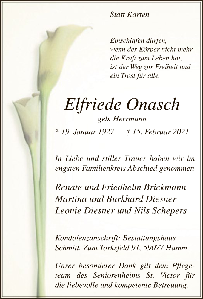 Hier finden Sie alle Traueranzeigen aus der Zeitung, die bisher für Elfriede Onasch erschienen sind. Weitere Traueranzeigen, die in der Zeitung erscheinen, werden hier ebenfalls aufgelistet