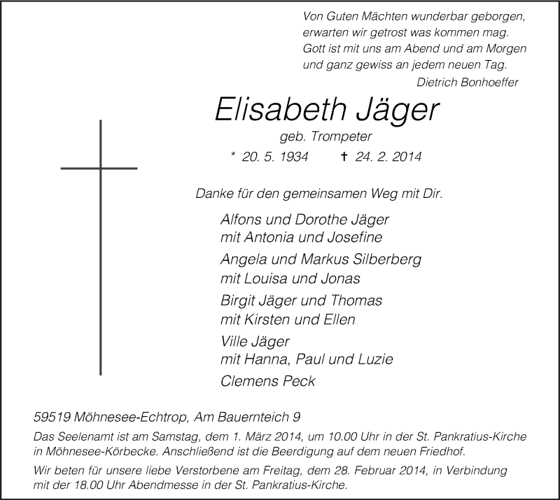 Hier finden Sie alle Traueranzeigen aus der Zeitung, die bisher für Elisabeth Jäger erschienen sind. Weitere Traueranzeigen, die in der Zeitung erscheinen, werden hier ebenfalls aufgelistet
