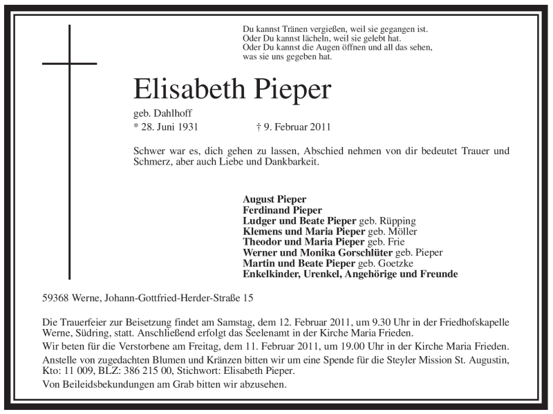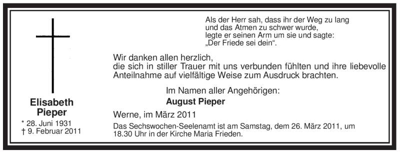 Hier finden Sie alle Traueranzeigen aus der Zeitung, die bisher für Elisabeth Pieper erschienen sind. Weitere Traueranzeigen, die in der Zeitung erscheinen, werden hier ebenfalls aufgelistet