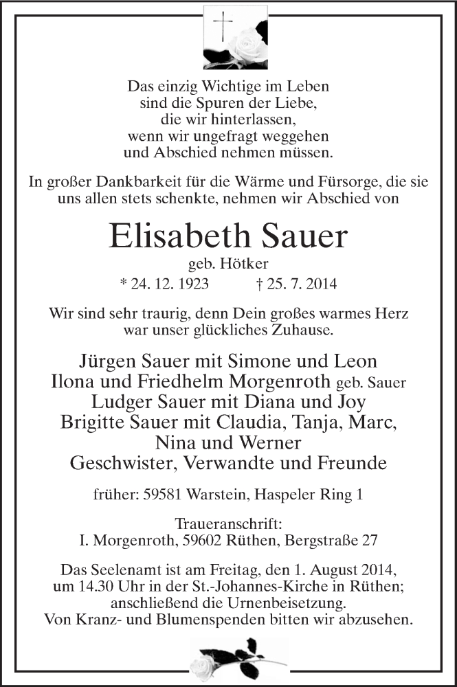 Hier finden Sie alle Traueranzeigen aus der Zeitung, die bisher für Elisabeth Sauer erschienen sind. Weitere Traueranzeigen, die in der Zeitung erscheinen, werden hier ebenfalls aufgelistet