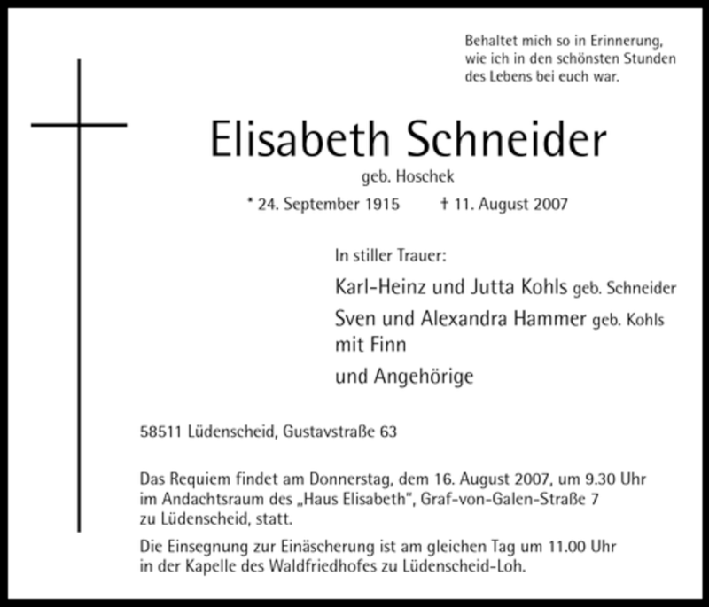 Hier finden Sie alle Traueranzeigen aus der Zeitung, die bisher für Elisabeth Schneider erschienen sind. Weitere Traueranzeigen, die in der Zeitung erscheinen, werden hier ebenfalls aufgelistet