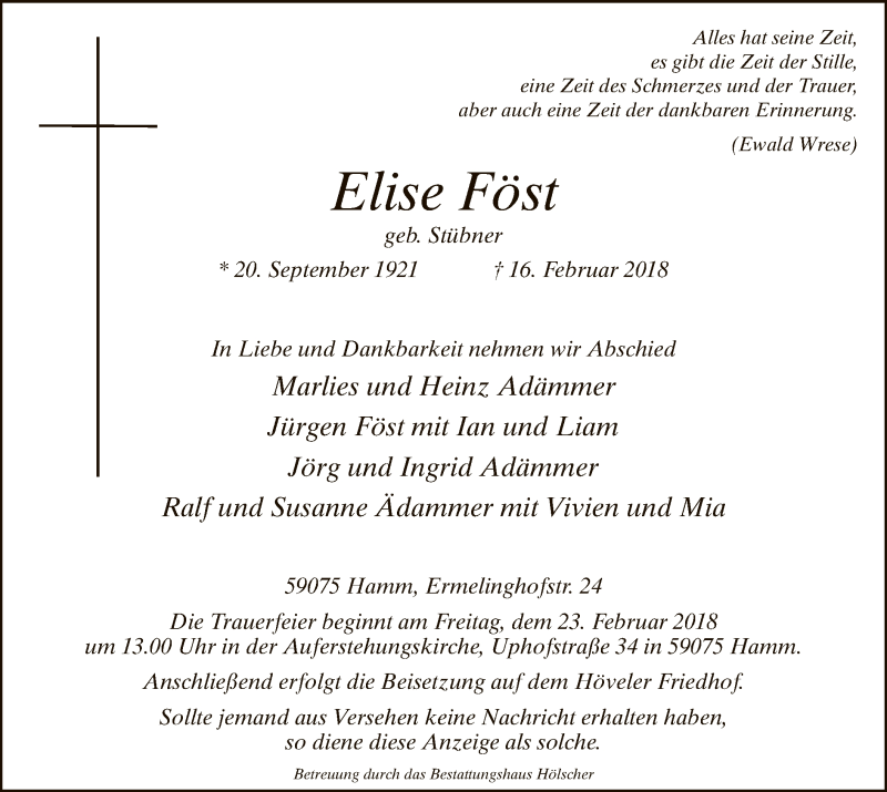 Hier finden Sie alle Traueranzeigen aus der Zeitung, die bisher für Elise Föst erschienen sind. Weitere Traueranzeigen, die in der Zeitung erscheinen, werden hier ebenfalls aufgelistet