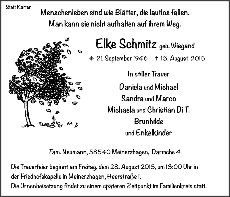 Hier finden Sie alle Traueranzeigen aus der Zeitung, die bisher für Elke Schmitz erschienen sind. Weitere Traueranzeigen, die in der Zeitung erscheinen, werden hier ebenfalls aufgelistet