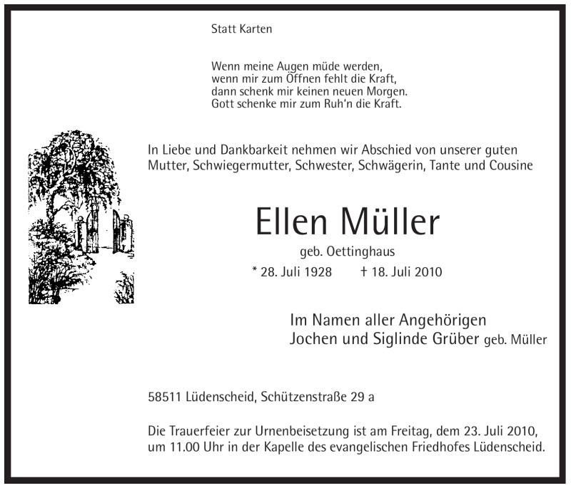Hier finden Sie alle Traueranzeigen aus der Zeitung, die bisher für Ellen Müller erschienen sind. Weitere Traueranzeigen, die in der Zeitung erscheinen, werden hier ebenfalls aufgelistet